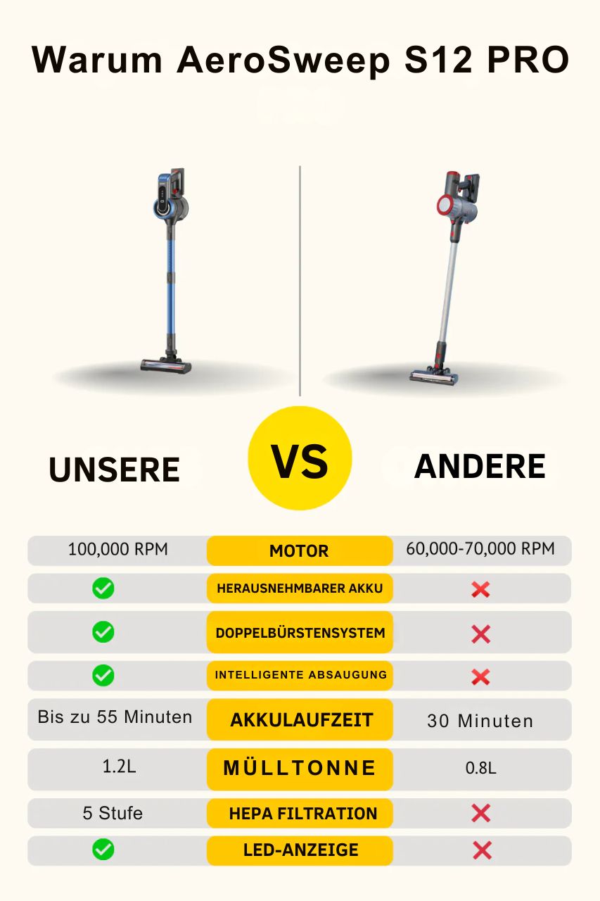 Der AeroSweep S12 Pro vereint Hochgeschwindigkeits-Saugkraft, intelligente Leistung und kabellose Freiheit, um die tägliche Reinigung schneller und einfacher zu machen. Sein leistungsstarker Motor mit 100.000 U/min sorgt für eine gründliche Reinigung auf allen Oberflächen.