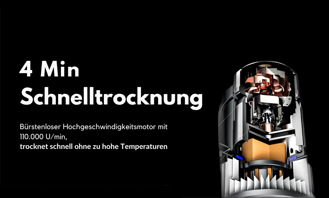 Der Luftstrom wird verstärkt, um einen kontrollierten, schnellen Luftstrahl für schnelles Trocknen zu erzeugen.