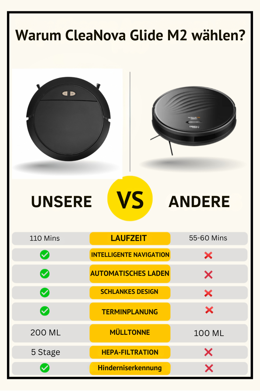 Ich wusste nicht, was mich erwarten würde, aber der Cleanova Glide M7 hat alles übertroffen. Er kartiert meine Wohnung perfekt und lädt sich selbstständig wieder auf – ein absoluter Wendepunkt.