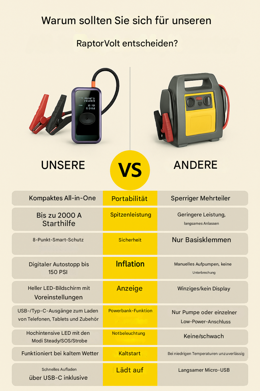 Ich war total begeistert, wie schnell RaptorVolt mein Auto wieder zum Laufen brachte. Kein Warten, keine zweiten Versuche – einfach die Klemmen angeschlossen, den Strom eingeschaltet, und schon brüllte der Motor.